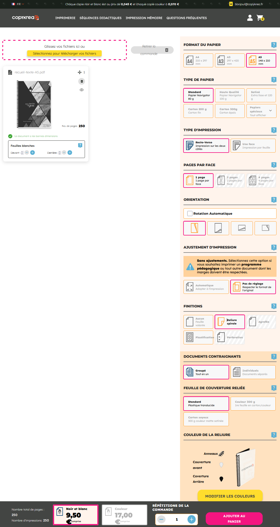 Réglages recommandés pour un recueil à 9,50€ imprimé et relié